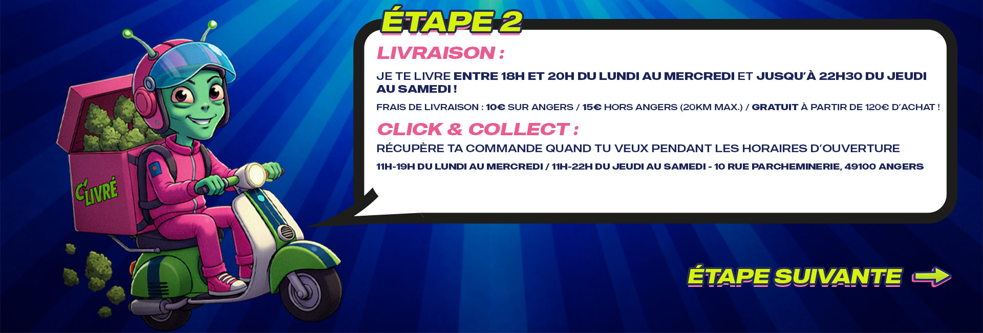 Livraison locale assurée par notre service interne, sur Angers et alentours. Minimum 25€ de commande. Gratuit à partir de 89€ d'achat + 10G offerts